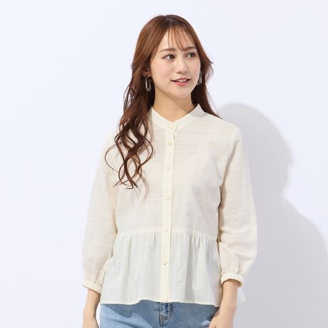 小柄さんにぴったりのバンドカラーブラウス。切り替えることでウエスト位置を高く見せ、ギャザーを入れてフェミニンな雰囲気に仕立てています。