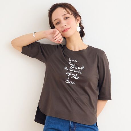 後丈長めのデザイン。ブラウスやジャケットのインナーとしてだけでなく一枚でもサマになるアイテム。色違いでも持っておきたくなるTシャツ。ホワイト・ブラウン・ブラックの3色展開。