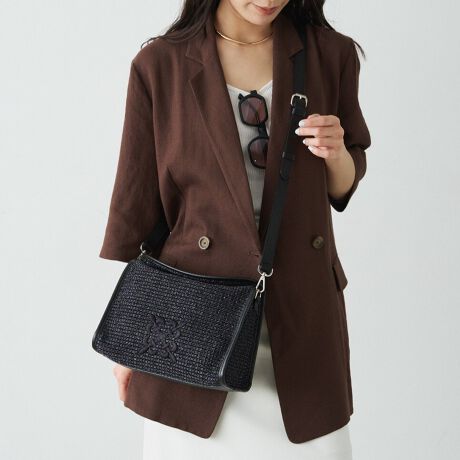 ナイロンラフィアの軽やかな風合いに、レザー使いで上質感を添えたショルダーバッグ。