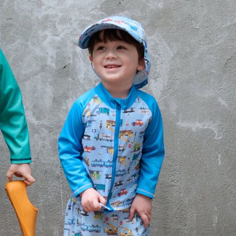 電車や働く車などさまざまな車両が描かれた乗り物柄のラッシュガードです。