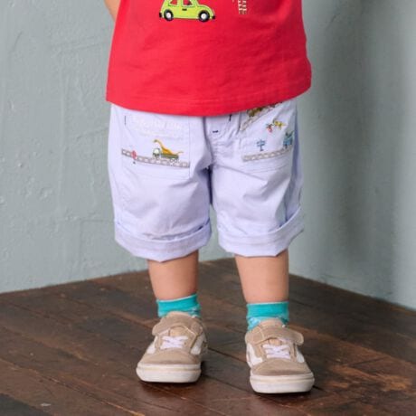 道を走る乗り物と恐竜さんが刺しゅうされた5分丈パンツです。