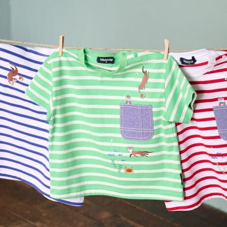 異素材の胸ポケットをあしらった「水族館」シリーズのボーダーTシャツです。水族館の人気者であるコツメカワウソや、お魚などが刺しゅうされています。ベーシックなシルエットで着回しやすく、デイリーコーデにぴったり。80、90サイズのみ肩開き仕様です。内側にお名前を記入できるタグつき。