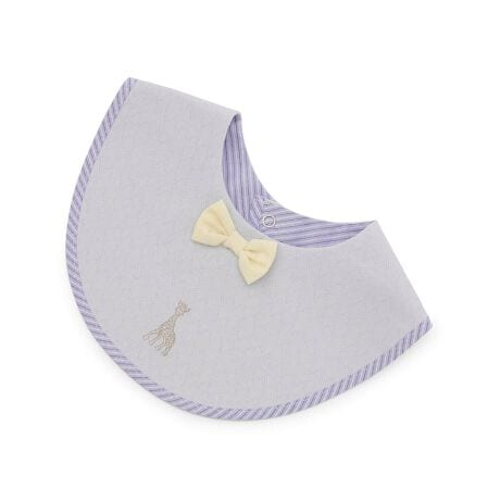 小さな蝶ネクタイがついたきちんと感のあるスタイです。裏面のストライプ地とソフィー刺しゅうでおしゃれな雰囲気を高めました。やわらかな綿100%素材でやさしい肌当たりも魅力。後ろにスナップボタンを備えており、簡単につけ外しできます。