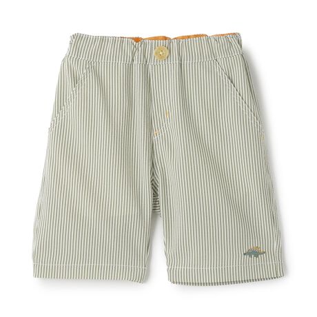 ステゴサウルスの刺しゅうや織りネームをあしらった6分丈パンツです。