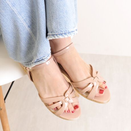 ・キャンディーのように艶やかなエナメル素材のフラットサンダル。