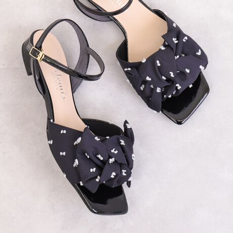 ・グログラン素材のビッグリボンが目をひくフラットサンダル。