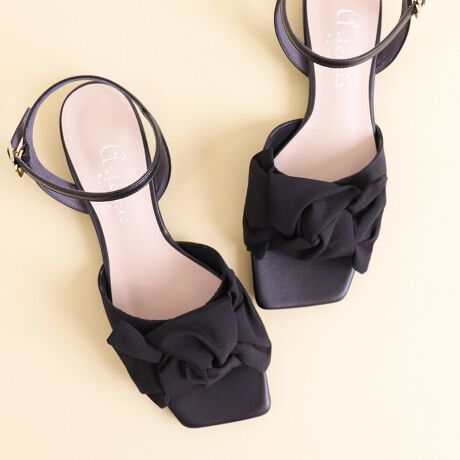 ・グログラン素材のビッグリボンが目をひくフラットサンダル。