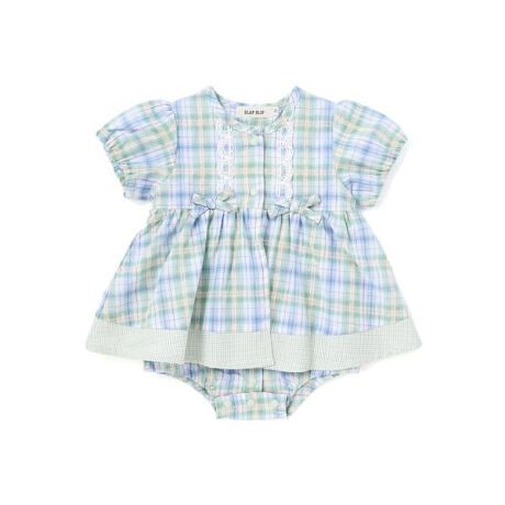 マドラスチェックにリボンをあしらった、女の子ベビー用のカバーオール。