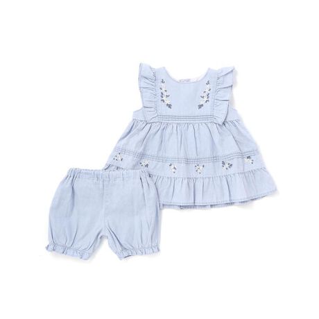 カラーごとに異なる素材と刺しゅうが楽しめる、女の子ベビーのための愛らしいセットアップ。
