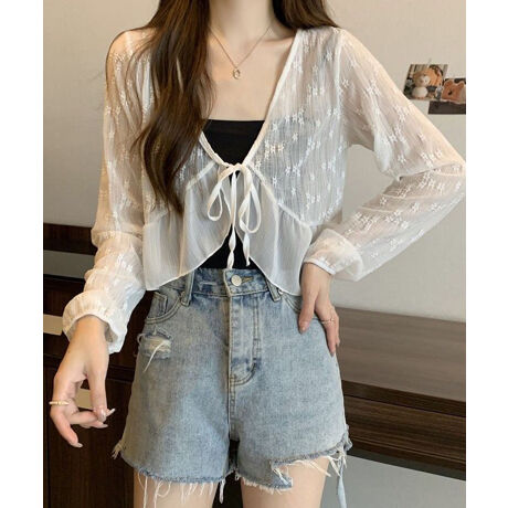 軽やかな透け感とリボンディテールが女性らしさを引き立てる、夏のシアーカーディガン。