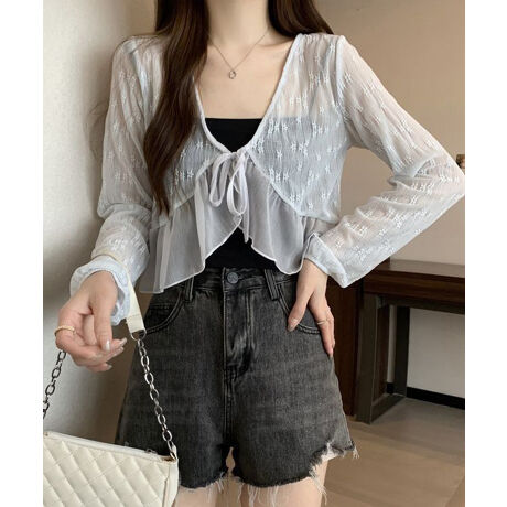 軽やかな透け感とリボンディテールが女性らしさを引き立てる、夏のシアーカーディガン。