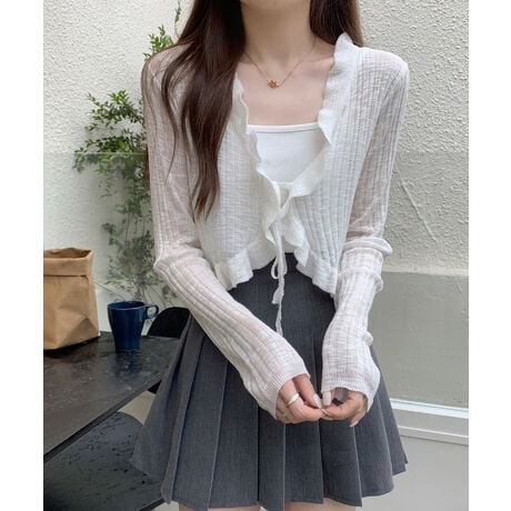 軽やかな透け感とフリルデザインで、フェミニンに仕上がる春夏シアーカーディガン。