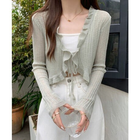 フリルリボンシアーリブショートカーディガン