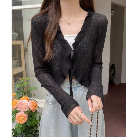 フリルリボンシアーリブショートカーディガン