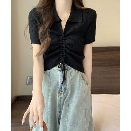シャーリングドロストリブニットポロクロップドトップス
