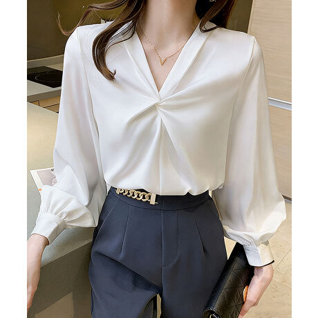 フロントツイストVネックとろみサテンブラウス