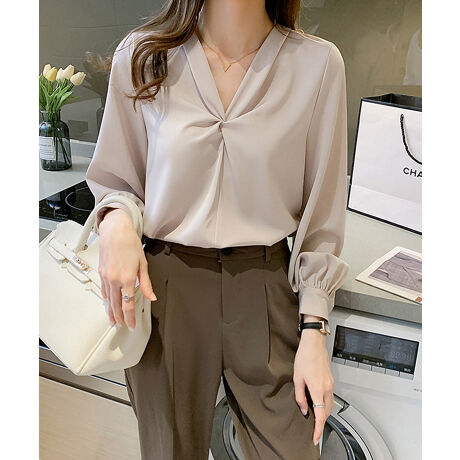 フロントツイストVネックとろみサテンブラウス