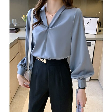 華やかな光沢感と立体ツイストで上品に決まる大人きれいめブラウス