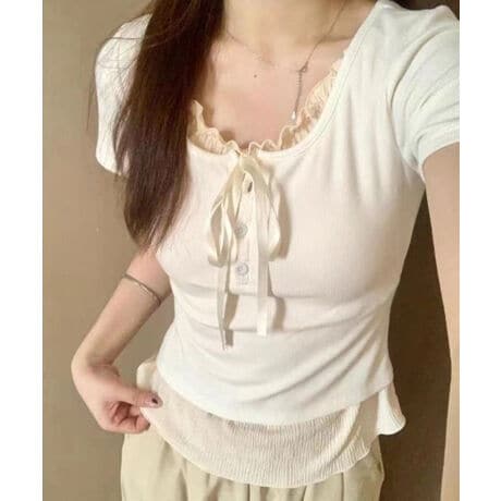 配色フリルと華奢リボンが映えるレイヤード風フェミニンリブトップス