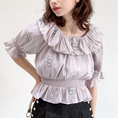 アリッサムの花刺繍が目を惹くオフショルブラウス。