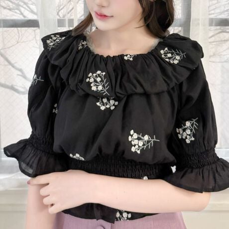 アリッサムの花刺繍が目を惹くオフショルブラウス。