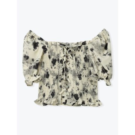 [型番:26560787070]繊細な花柄とシャーリングデザインが目を引く、コンパクトなシルエットのトップス。フロントのレースアップがさりげないアクセントになり、立体感のある表情に仕上げています。マーメイドスカートやタイトスカートと合わせて、女性らしさを活かしたスタイリングもおすすめの一枚です。