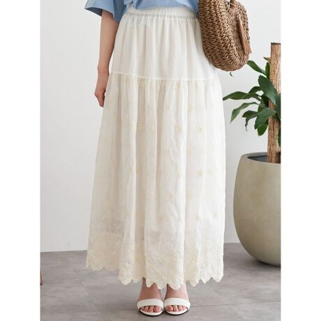 繊細な花モチーフの刺しゅうをあしらった軽やかなロングスカート。