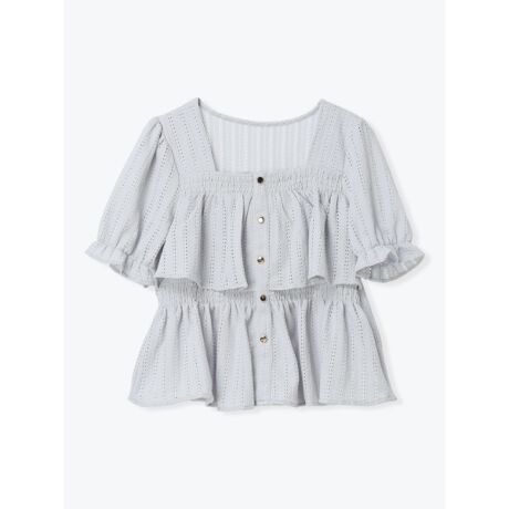 [型番:26550736233]透かし編みとフリルディテールが印象的な5分袖プルオーバー。軽やかな素材で程よく肌がのぞき、やわらかな雰囲気に仕上がります。キャミソールをインナーに合わせて抜け感を活かし、タック入りのワイドパンツを穿いて甘さを抑えたバランスにまとめるのもおすすめです。