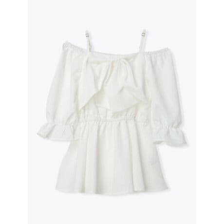 [型番:26560789117]さりげないラメ感とリボンディテールが華やかなオフショルダーブラウス。肩まわりをきれいに見せつつ、程よい抜け感のあるバランスに仕上がります。ハイウエストのワイドパンツを穿いてメリハリのあるスタイルに、タイトスカートと合わせて女性らしいシルエットを楽しむのもおすすめです。モデル(紫着用)身長:160cmMサイズ着用