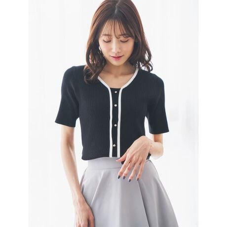 [型番:26550735805]配色ラインがアクセントになった半袖ニットカーディガン。すっきりとしたシルエットで、軽やかに羽織れる一枚です。前を閉じてプルオーバー風に着てワイドパンツを穿けばバランスよくまとまり、キャミワンピースの上に羽織って女性らしいレイヤードも楽しめます。モデル(黒着用)身長:165cmMサイズ着用