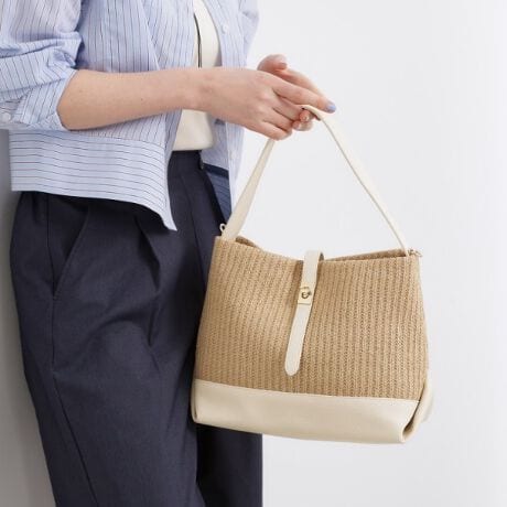 軽やかな編み素材と上品な合皮をミックスした、季節感ときちんと感を両立する2WAYバッグ。