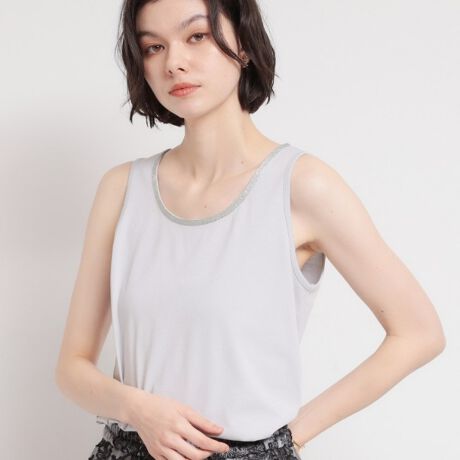 シンプルなタンクトップの衿ぐりに、きらりと艶めくパーツをぐるりと一周トリミング。