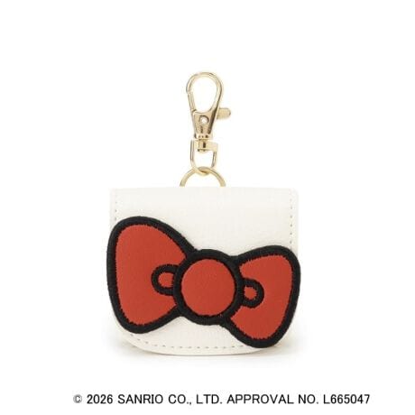 ハローキティのお顔とトレードマークのリボンを合成皮革でフラップに付けたチャームポーチ。