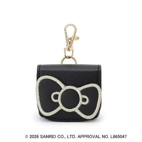 ハローキティのお顔とトレードマークのリボンを合成皮革でフラップに付けたチャームポーチ。