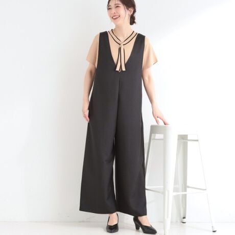 深めのVネックがすっきりした印象のシンプルなオールインワン。