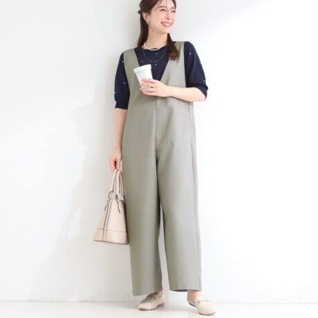 深めのVネックがすっきりした印象のシンプルなオールインワン。