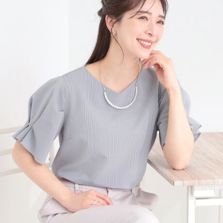 お袖にタックディティールが入っており、二の腕が自然にカバーできる半袖のブラウスです。
