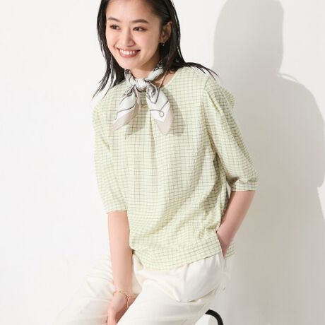 表情豊かなチェック柄の涼しい夏素材を使用したデザインブラウスです。