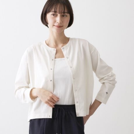 小ぶりなスナップボタンがさりげないアクセントのジャージーカーディガン。