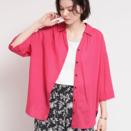 バックギャザーを効かせた前開きの7分袖シャツ。