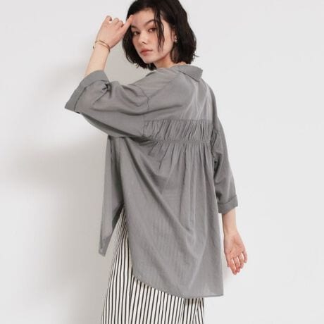 バックギャザーを効かせた前開きの7分袖シャツ。