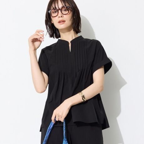 胸元の細やかなピンタックが立体感を生み、程よい華やかさを添えるブラウスです。