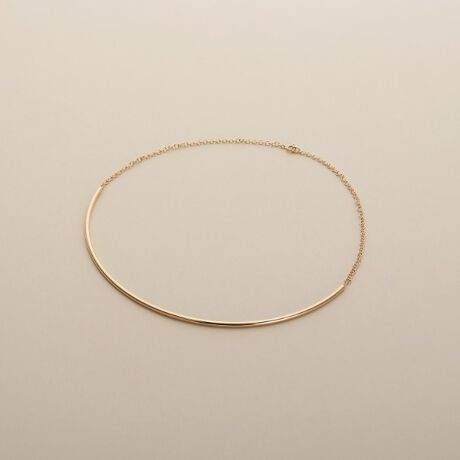 メタルの艶やかな表情が、首元にモードなアクセントをプラスしてくれるハーフ仕様のネックレス。