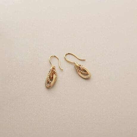 異なるパターンのデザインパーツの組み合わせが印象的なピアス。