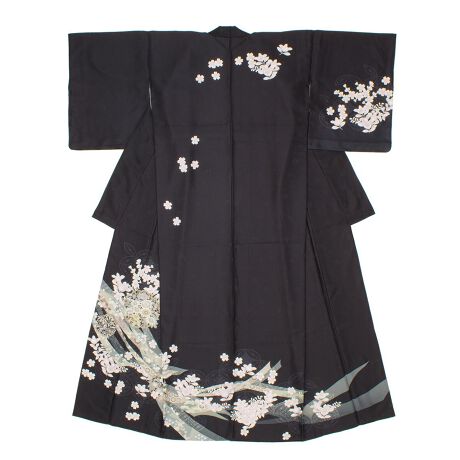 甘さ控えめで落ち着きのあるダスティーカラーの織柄の生地に、桜や梅の花唐草、雪輪や束熨斗に桜や橘など、吉祥の豪華な柄ゆきです。
