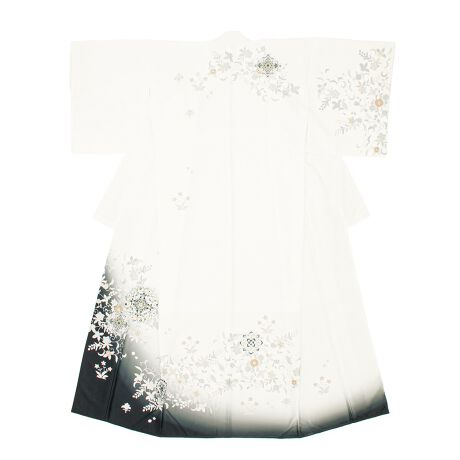 甘さ控えめで落ち着きのあるダスティーカラーの織柄の生地に、桜や梅の花唐草、雪輪や束熨斗に桜や橘など、吉祥の豪華な柄ゆきです。