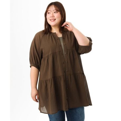 前開き仕様なので、ブラウスとしてはもちろん、軽い羽織りとしても着用可能。
