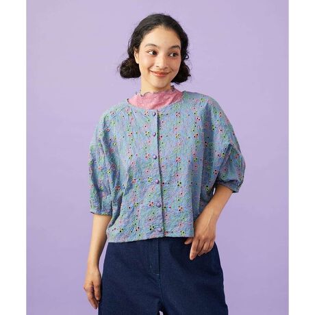 花柄の刺繍が華やかなブラウス。ゆったりとした身幅とアームホールの丸みのあるシルエットが、女性らしい雰囲気を後押しします。前開きデザインで羽織としての着用もオススメ。華やかな総刺繍のブラウスはコーデの主役にぴったりです。