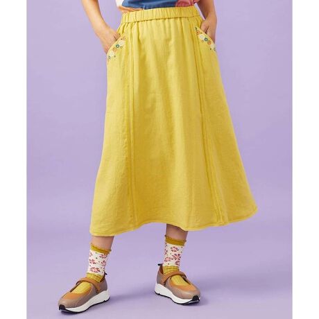気取らずに穿けるフレアスカート。裾にかけてゆるやかに広がるフレアシルエットです。前後に縦の接ぎ目を施すことで、リラックス感のある着用感ながらもすっきり見えを実現。ポケット口にはドットの配色刺繍を施し、ホコモモラならではのデザインに。接ぎ目と裾には共地のバイアステープを使用し、フリンジのようなフサフサとしたディテールに注目です。