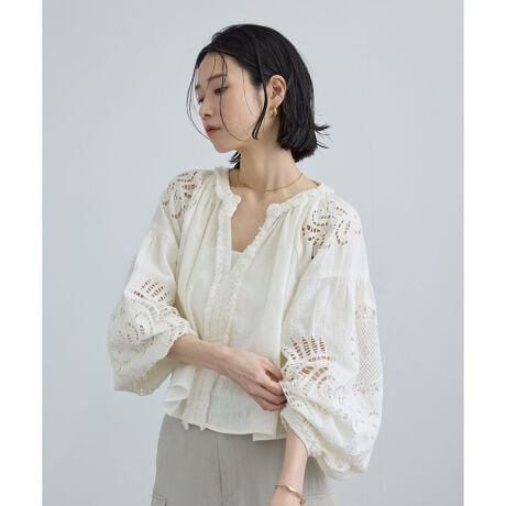 ふんわりとしたボリュームスリーブと繊細なカットワークが軽やかで涼しげな印象を与えます。